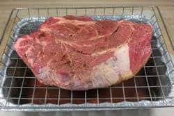 - If possible, place the chuck roast on a Bradley rack and sit that right on top of the pan. This allows the smoke to have full access to the meat and the juices from the roast can drip down into the pan keeping the smoker clean and giving us some nice, tasty meat juice.