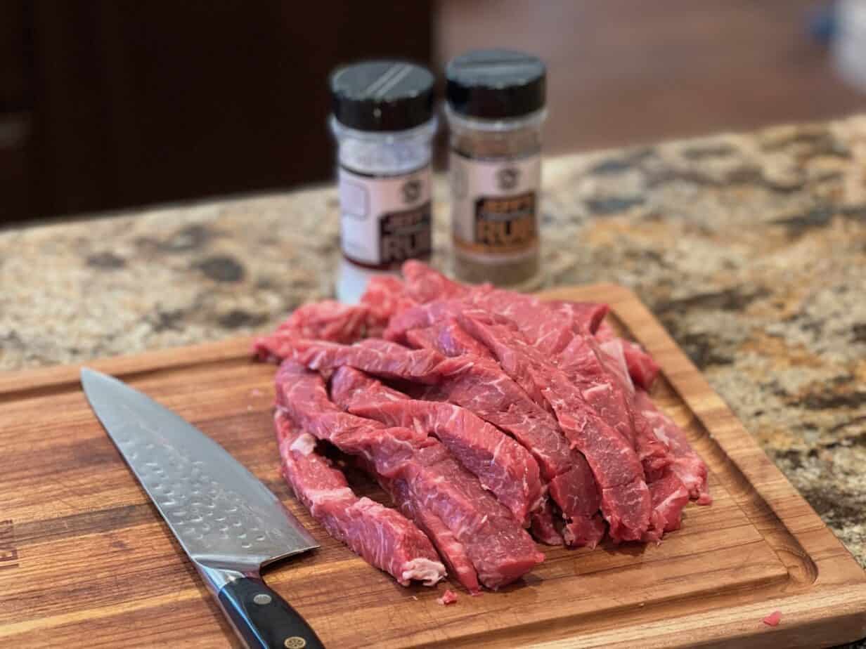 In taking the pictures for this, we had to use NY strips that were around ¾ inch thick so we sliced them only ¼ inch thick along the longest side.