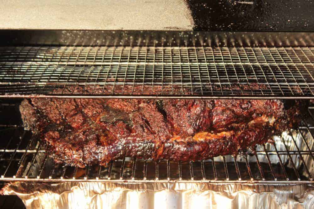 I recommend placing a pan under the brisket, if possible, in order to catch the tasty juices as they render or melt.
