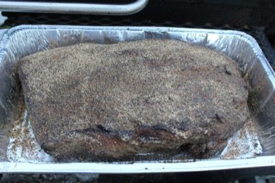 Place the pan with the brisket on the smoker grate. Make sure the brisket is fat side up.
