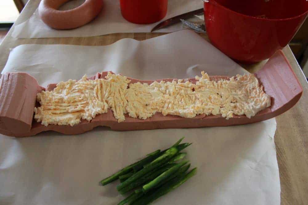 Once the cut is finished, unroll the bologna to lay it open and make it ready for stuffing.