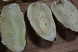 - Scoop the potato out of the halves and place into a medium sized bowl.