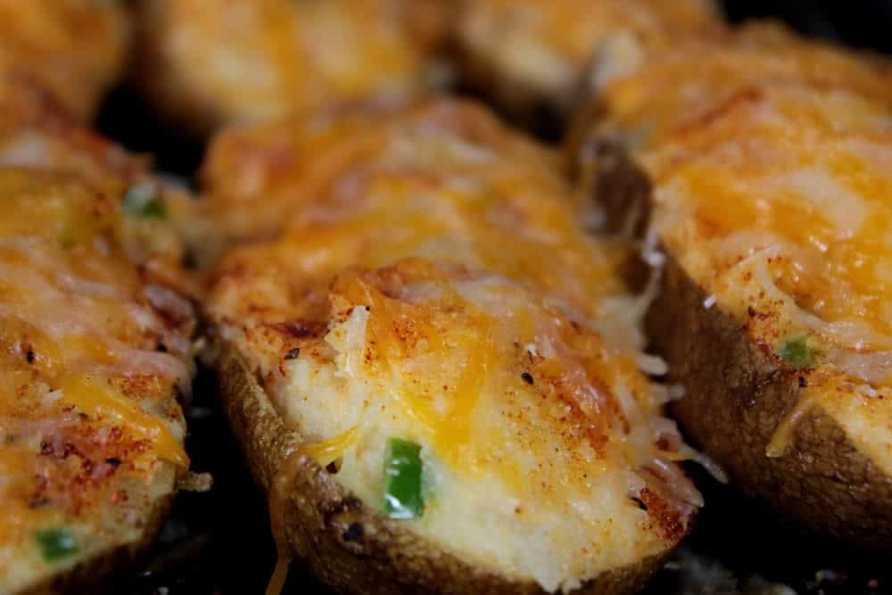 These are called smoked twice baked potatoes because you bake them in the smoker (or any heat source for that matter), cut them in half, scoop out the insides and mix it with my original rub , bacon, cream cheese, jalapeños, etc., and grated cheese on top, then put it back into the potato skins and bake them even more until the cheese melts on top.